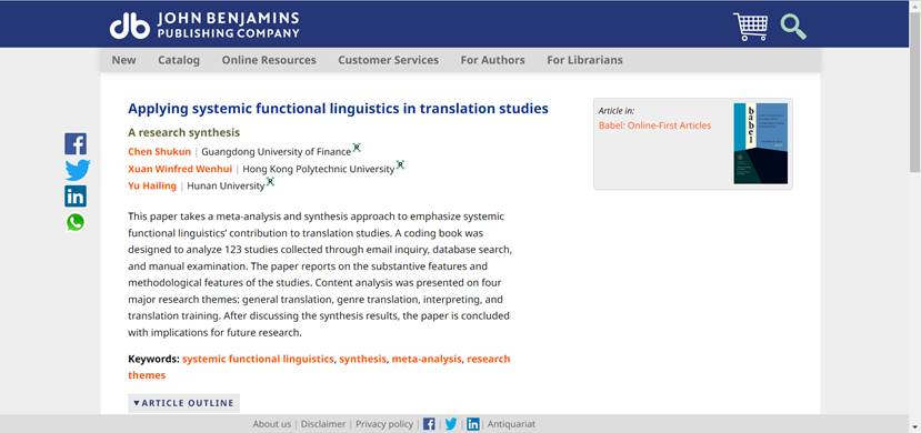 近日,公司9428cn太阳集团古天乐教师陈树坤博士的最新研究成果“Applying systemic functional linguistics in translation studies: A research synthesis”在《Babel》上正式刊发。《Babel》是国际译学界公认的最具影响力的翻译学期刊之一,系国际顶尖翻译学学术刊物。陈树坤为该成果的第一作者,9428cn太阳集团古天乐为第一单位。