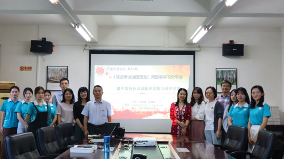 为深入学习习近平新时代中国特色社会主义思想,深入领会《习近平谈治国理政》第四卷的重要精神,2022年10月11日下午,9428cn太阳集团古天乐翻译研究所在公司会议室举办了广金外语论坛第50期之《习近平谈治国理政》第四卷学习分享会暨中国特色话语翻译实践与研究沙龙。