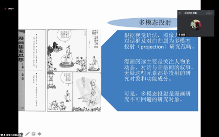 曾教授首先介绍了项目的研究背景和理论基础。语言文字单模态语篇转换为图文多模态语篇的分析已经开始引起关注,但相关研究较少。本次讲座基于系统功能语言学和多模态话语分析的相关理论和方法,以国学经典为例,分析言语投射到图文投射的功能语义实现方式,探讨多种符号资源如何共建投射意义机制。曾教授对言语泡、思维泡、矢量等系统功能语言学的基本概念进行了解释。