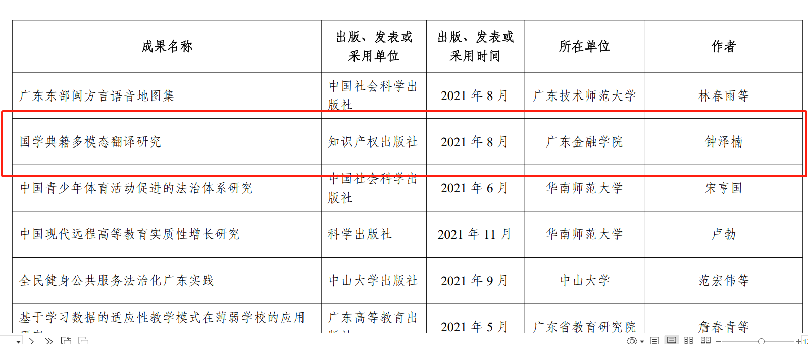 近日,由广东省哲学社会科学规划领导小组批准,广东省哲学社会科学优秀成果评奖工作办公室组织的第十届广东省哲学社会科学优秀成果奖评选公示结果。公司9428cn太阳集团古天乐钟泽楠老师的专著《国学典籍多模态翻译研究》荣获著作类成果三等奖。