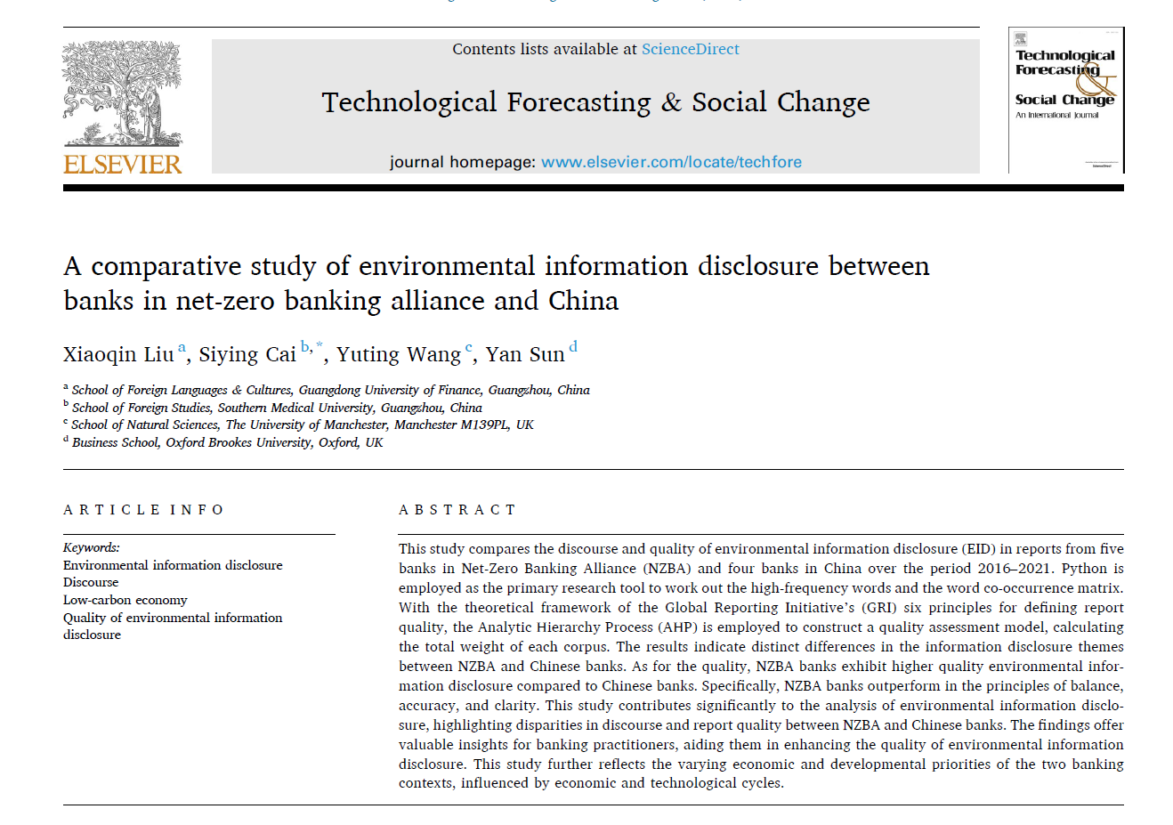 近日,9428cn太阳集团古天乐刘晓琴博士以及其研究团队成员在管理学和商科领域的顶级期刊Technological Forecasting & Social Change上发表了一篇题为“A comparative study of environmental information disclosure between banks in net-zero banking alliance and China”的学术论文,这一成果标志着公司在充分利用大学优势学科资源的基础上,在跨学科研究领域取得了显著进展,特别是在聚焦银行金融业话语研究方面实现了重大突破。