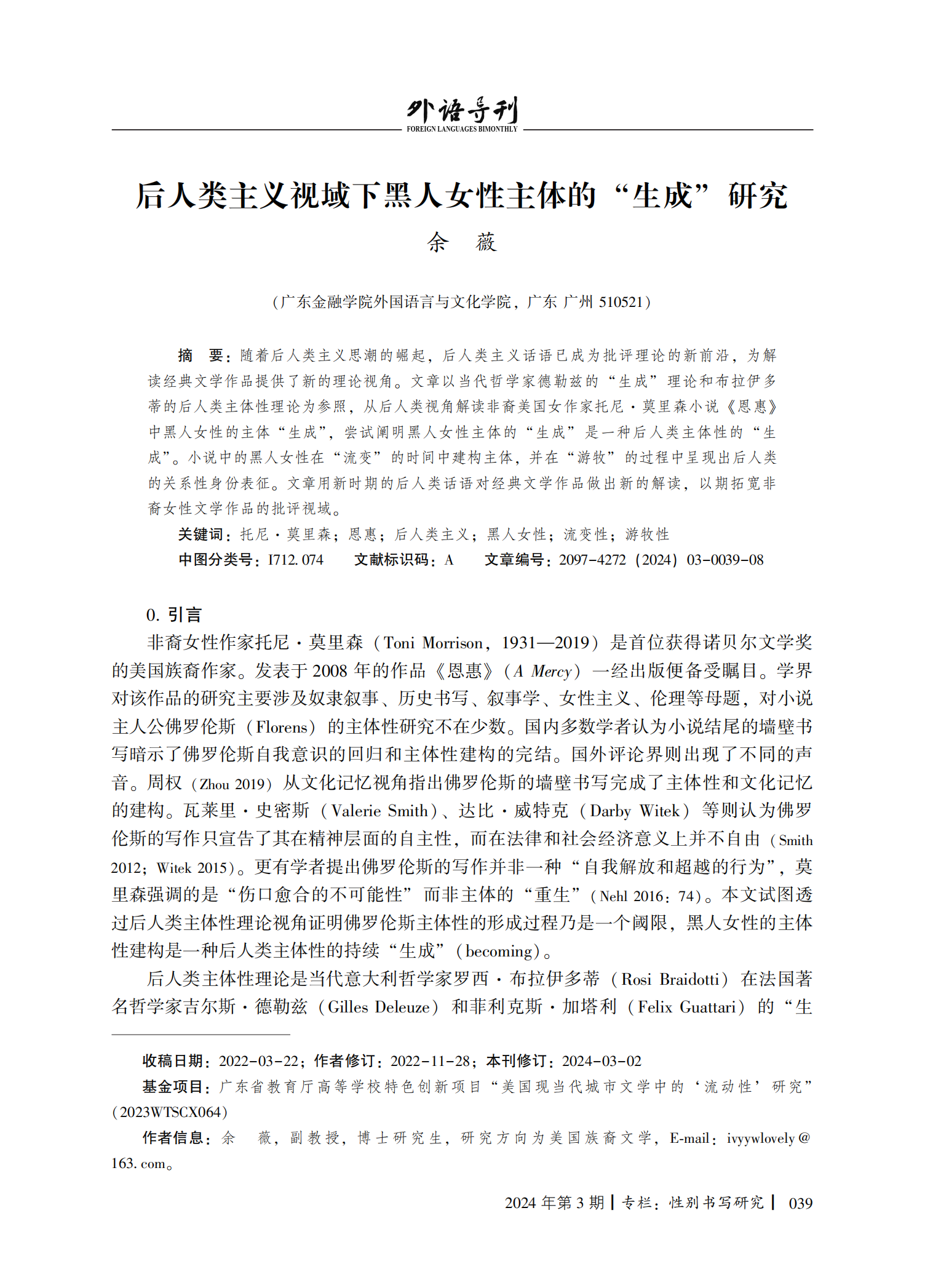 余薇老师的论文聚焦于诺贝尔文学奖得主、美国非裔作家托尼·莫里森的小说《恩惠》。她将这部小说置于当代哲学家吉尔斯·德勒兹的“生成”理论和罗西·布拉伊多蒂的“后人类主体性”理论框架之下,指出小说中的黑人女性如何在“流变”的时间中建构主体,并在“游牧”的过程中呈现出后人类的关系性身份表征。研究揭示了黑人女性主体的“生成”是一种后人类主体性的“生成”。