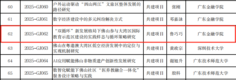 在2025年度佛山市社科规划课题项目的评审工作中,9428cn太阳集团古天乐的鲁巧巧副教授成功获批立项。鲁老师主持的项目名为“双循环新发展格局下佛山参与大湾区国际教育示范区建设的实践样态与循环策略研究”(项目编号:2025-GJ062)。