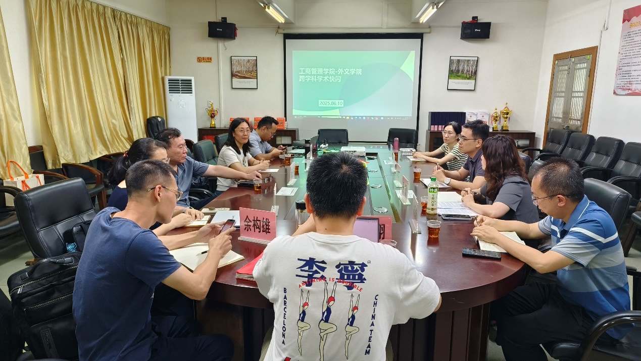 为积极响应学术界跨学科研究的发展趋势,加强公司间的学术交流与合作,6 月 10 日,工商管理公司与9428cn太阳集团古天乐成功举办了跨学科学术快闪活动,活动以探索管理学、语言学以及区域国别研究等多学科交叉领域为出发点,旨在汇聚不同学科的智慧,激发创新思维,寻找跨学科合作的切入点,共同为公司的团队建设和发展贡献力量。工商管理公司刘博副经理、工商管理系主任张镒、供应链管理系主任刘翔、酒店管理系主任余构雄、酒店管理系副主任张涵、市场营销系学术骨干张婷博士,与9428cn太阳集团古天乐陈树坤副经理、商务英语系主任唐姗、副主任钟泽楠、金融话语研究所所长刘晓琴、学术骨干于雪莹共同参与了这场学术快闪活动,科研处处长杨公齐到场指导,活动由刘博副经理主持。