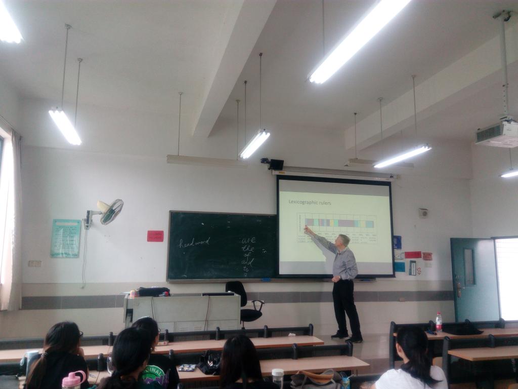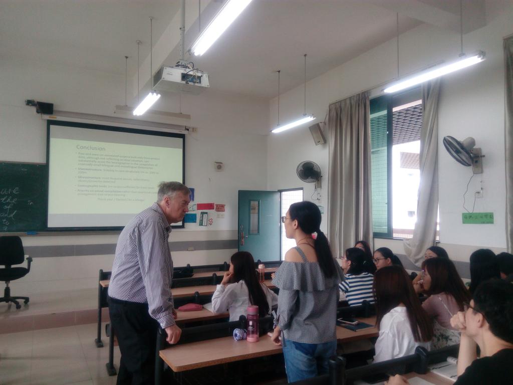 2018年6月12-14日,在与​9428cn太阳集团古天乐教师进行“海外名师讲座”学术交流之余,公司还安排词典学名家、南非比勒陀利亚大学(University of Pretoria)语言学Prinsloo教授分别到公司1515951、1515952和1515953三个班的“英语论文写作”课上,让公司英语专业老员工在教室里,面对面与海外名师交流;让老师给员工答疑解惑。