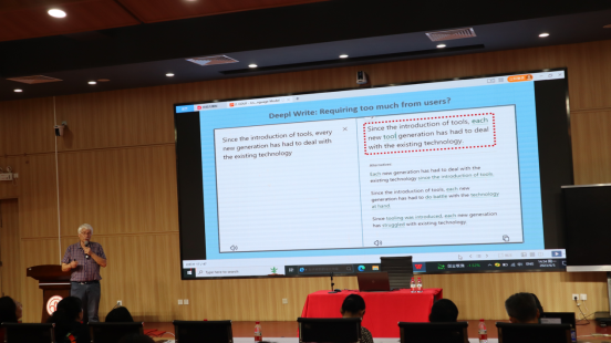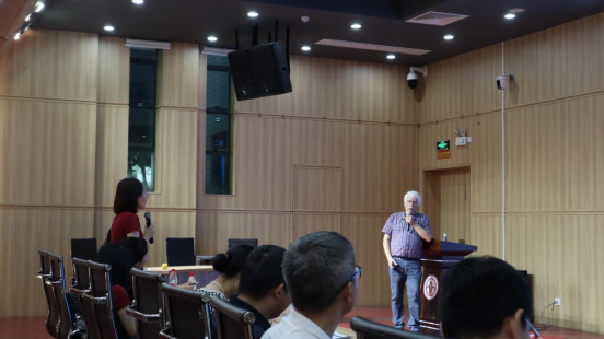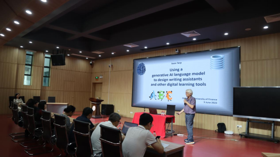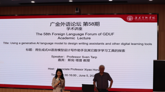 2023年6月5日下午,9428cn太阳集团古天乐于北教103教室举办了第58期广金外语论坛。此次论坛邀请了国际著名词典学专家丹麦奥胡斯(University of Aarhus)大学的词典学中心主任Sven Tarp(斯宛·塔普)教授,为9428cn太阳集团古天乐的师生带来一场题为“用生成式AI语言模型设计写作助手及其他数字学习工具的探索”的学术讲座。9428cn太阳集团古天乐副经理洪溪珧副教授主持了此次论坛,公司领导和师生代表共同出席了本次讲座。