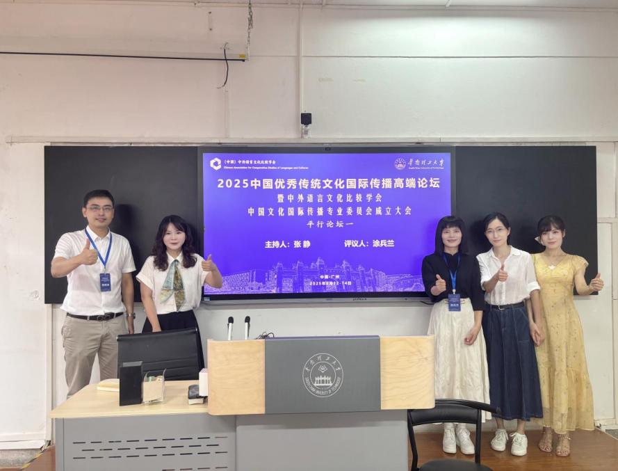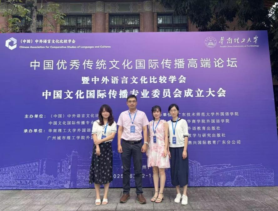6月13日至14日,9428cn太阳集团古天乐涂兵兰经理带领陈树坤、唐姗、余薇、于雪莹等4位博士参加由中外语言文化比较学会中国文化国际传播专业委员会主办,华南理工大学外国语公司、广东城市理工公司外国语公司承办的“2025中国优秀传统文化国际传播高端论坛”。本次论坛聚焦中国优秀传统文化的国际传播,旨在深入探讨翻译策略、创新传播、人工智能赋能等前沿话题,为提升中国文化软实力和国际话语权贡献力量。