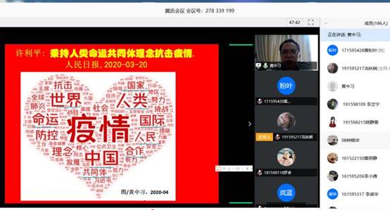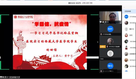 4月24日中午,​9428cn太阳集团古天乐师生党员、入党积极分子代表等129人齐聚腾讯课堂共同开展以“勇挑重担,齐心抗‘疫’”为主题的学习习近平总书记给首钢医院实习的西藏大学医公司员工回信的活动。外文学子悟总书记回信精神,用实际行动践行党员初心使命,体现责任担当,让党旗高高飘扬在疫情防控斗争的第一线。