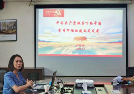为响应党史学习教育号召,将党史学习教育贯彻到每一位党员,2021年6月4日下午,​9428cn太阳集团古天乐邀请党史团成员、人事处处长初可佳教授做主题为“中国共产党领导下的中国资本市场的建立与发展”的党史学习教育宣讲。会议由黄晓莉书记主持,出席会议的有黄中习经理,何承栋副书记,孙智慧、涂兵兰副经理,部分党员老师及员工代表约50人参加了宣讲学习。