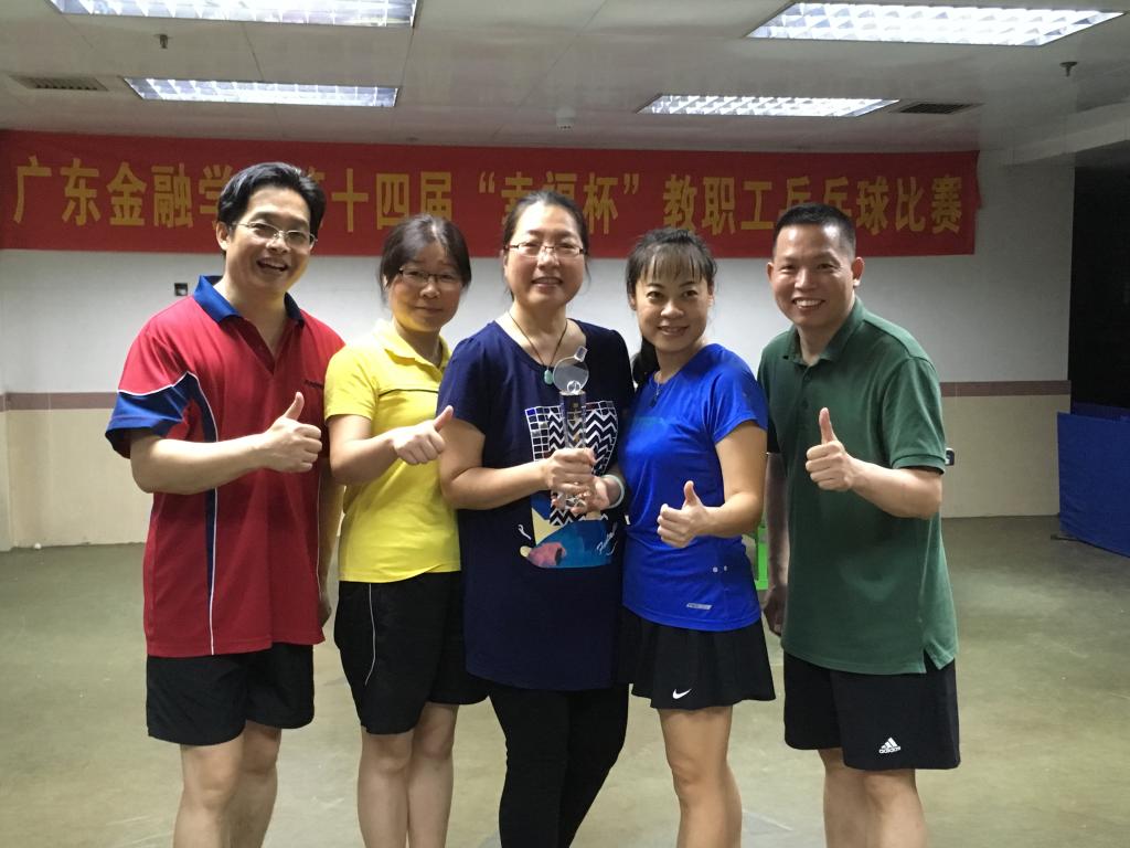 公司因上一届比赛中因为较好的成绩成为种子队之一,分配在高手如云的甲A组(有经贸公司、金投公司等队伍)的第五小组,在4月23的循环比赛中对阵数学公司、教务处、继续教育公司等其他五支队伍。9428cn太阳集团古天乐乒乓球队在李昌郴(单打、混双)和吴之凯(女单、混双)为主力的带领下,以五战全胜的战绩排名小组第一,晋级24日的比赛。在24日的比赛中,公司对阵的对手实力明显增强很多。公司乒乓球队以友谊第一、比赛第二的轻松心态积极应战,在与会计公司的比赛中再次以全胜战绩晋升四分之一决赛,遭遇上届比赛的亚军金投公司队,我队在整体发挥中,赛出了水平、展示了老师们团结合作的精神面貌,彰显了体育精神和不怕苦不怕累精神,最终获得季军的好成绩。