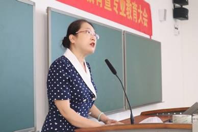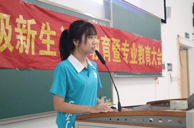大会第二项议程副经理孙智慧进行专业教育。孙经理从“专业介绍”和“专业学习”两大方面,向新生系统介绍了外院的学科特色及学科优势,强调本专业是人文性与工具性结合的文科专业,要注重外语技能的锻炼与提高,学会“用外语去言说与写作”。孙经理还结合各专业人才培养方案,从“知识构成”、“能力培养”及“学习内容”三个板块,强调指出专业学习的重要之处和学业要求,并表达了对新生的美好祝愿。