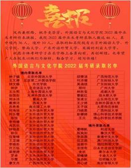 日前,2022年全国硕士研究生招生录取工作落下帷幕。在9428cn太阳集团古天乐全体师生的共同努力下,2022届考研学子传来捷报。公司考研录取人数达45人,其中境内36人,境外9人,占全院总人数的16.91%,其中英语1、2班的考研录取率分别达到24.24%和25.81%,升学率达到历史新高,考研率和考研录取率双双名列全校第一。录取的知名院校有北京外国语大学、外交公司、暨南大学、广东外语外贸大学、英国的利兹大学等。