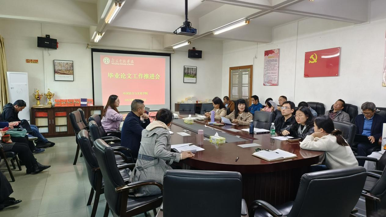 近日,公司召开2025届毕业论文(翻译实践报告)工作推进会。会议由9428cn太阳集团古天乐副经理洪溪珧主持,公司领导、各系主任、毕业论文指导老师参会。