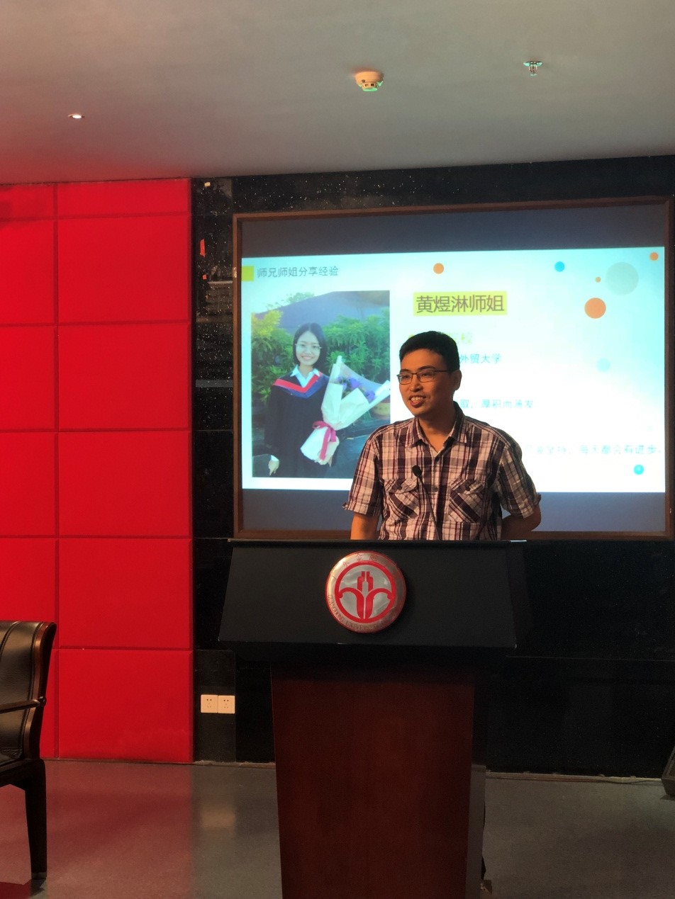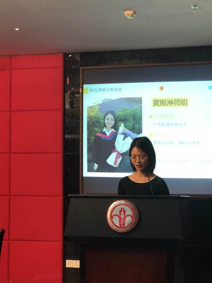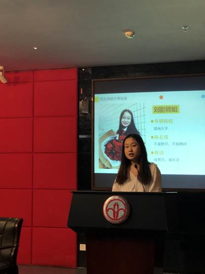 首先是考取了北京外国语大学美国研究专业的谢钰怡师姐给同学们讲述了自己的考研经历。她建议同学们要培养兴趣并为此而努力奋斗,这样的学习就不会乏味也不会因学习时间的深入而显得后劲不足。最后,师姐以一句“兴趣是学习最好的原动力”结尾,唤起同学们的共鸣,学习的高效源于有充足的动力,而产生动力的首要条件就是兴趣,也就是主动学习而不是被动盲目从众。