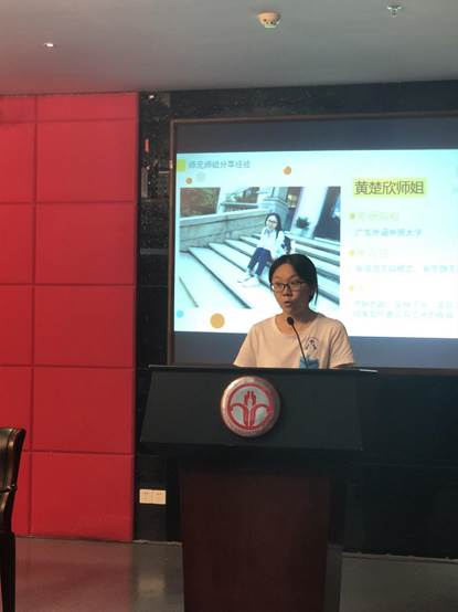 随后,考取了广东外语外贸大学翻译学专业的黄楚欣师姐围绕“向前辈学习”这一关键词展开,她建议我们要多和师兄师姐们交流经验,借鉴前辈的经验,让自己少走一些弯路。