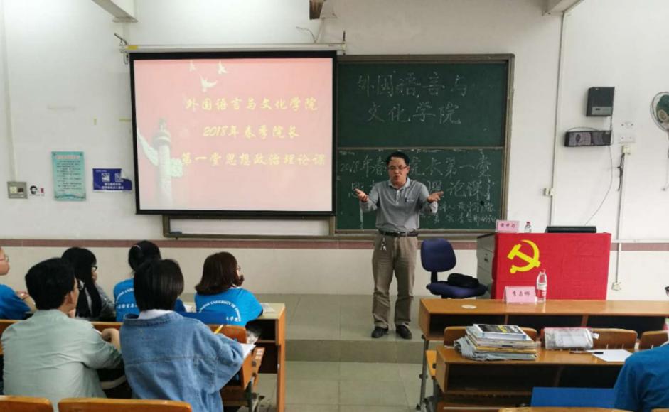 图为黄中习经理正在给17级入党积极分子讲授2018年春季第一堂思想政治理论课