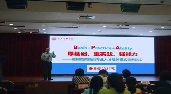 孙智慧副经理详细解读了广金融-广轻工协同培养的商务英语专业本科班的人才培养方案,介绍了专业课程设置与教学要求,从外语专长、人文素养、国际视野、中国情怀和校本特色五个方面向同学们讲解了课程设置的目的,着重强调全体员工一定要学好外语专长,要逐步提高专业的新台阶。