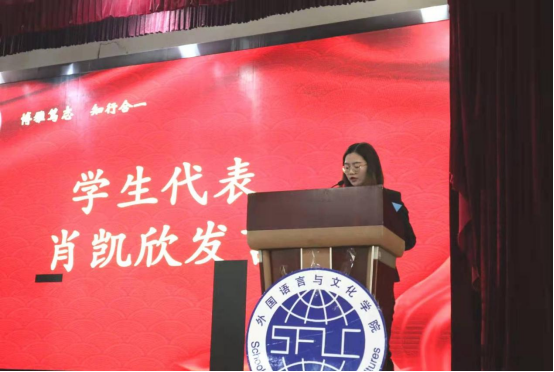 18级员工代表肖凯欣作为国家奖学金的获奖代表与同学们交流经验。肖凯欣同学提到“设立目标是成功的前提和基础”,表明订立目标,并坚定地跟随目标不断提升自我的重要性。同时,作为外语专业的员工,学习应注重日积月累,养成一个学习英语的良好习惯也尤为重要。此外,还要在各种各样的实践中提升自己,提升自身综合素养。最后,肖凯欣同学希望所有外文学子都不忘初心,怀揣梦想,积极进取,成就自我!