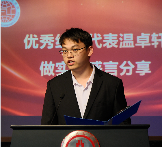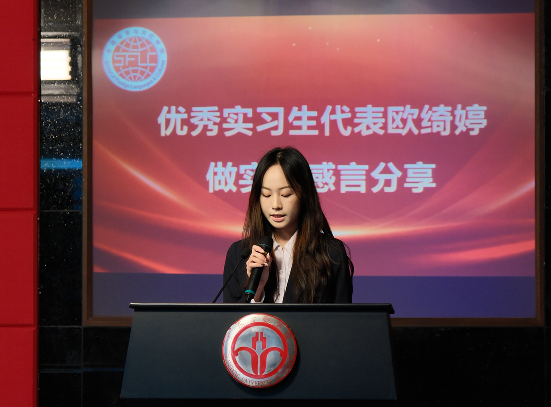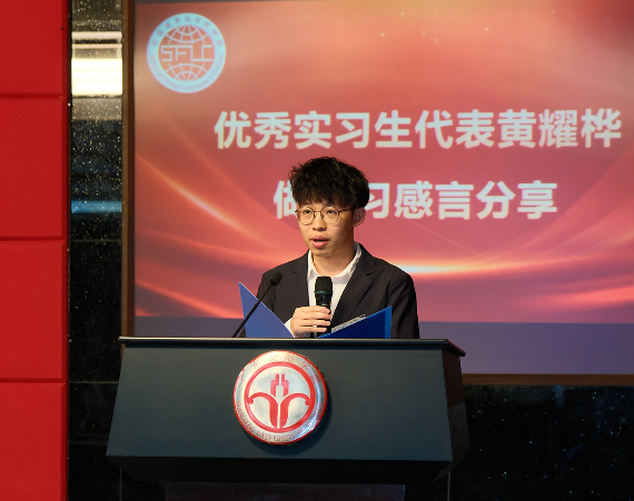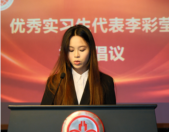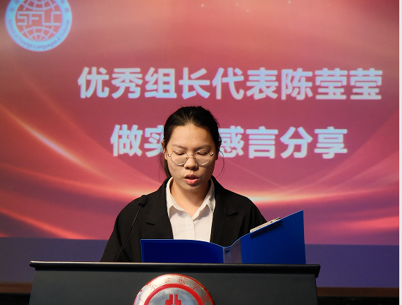 会上,优秀实习生代表欧绮婷、黄耀桦,优秀组长代表温卓轩、陈莹莹分别上台作实习感言分享。优秀实习生代表李彩莹倡议同学们要以自身的语言能力作为基础,用耐心与真诚做好服务,带着从广交会收获的热忱,在更多国际交流的场景中勇敢发声、积极作为。
