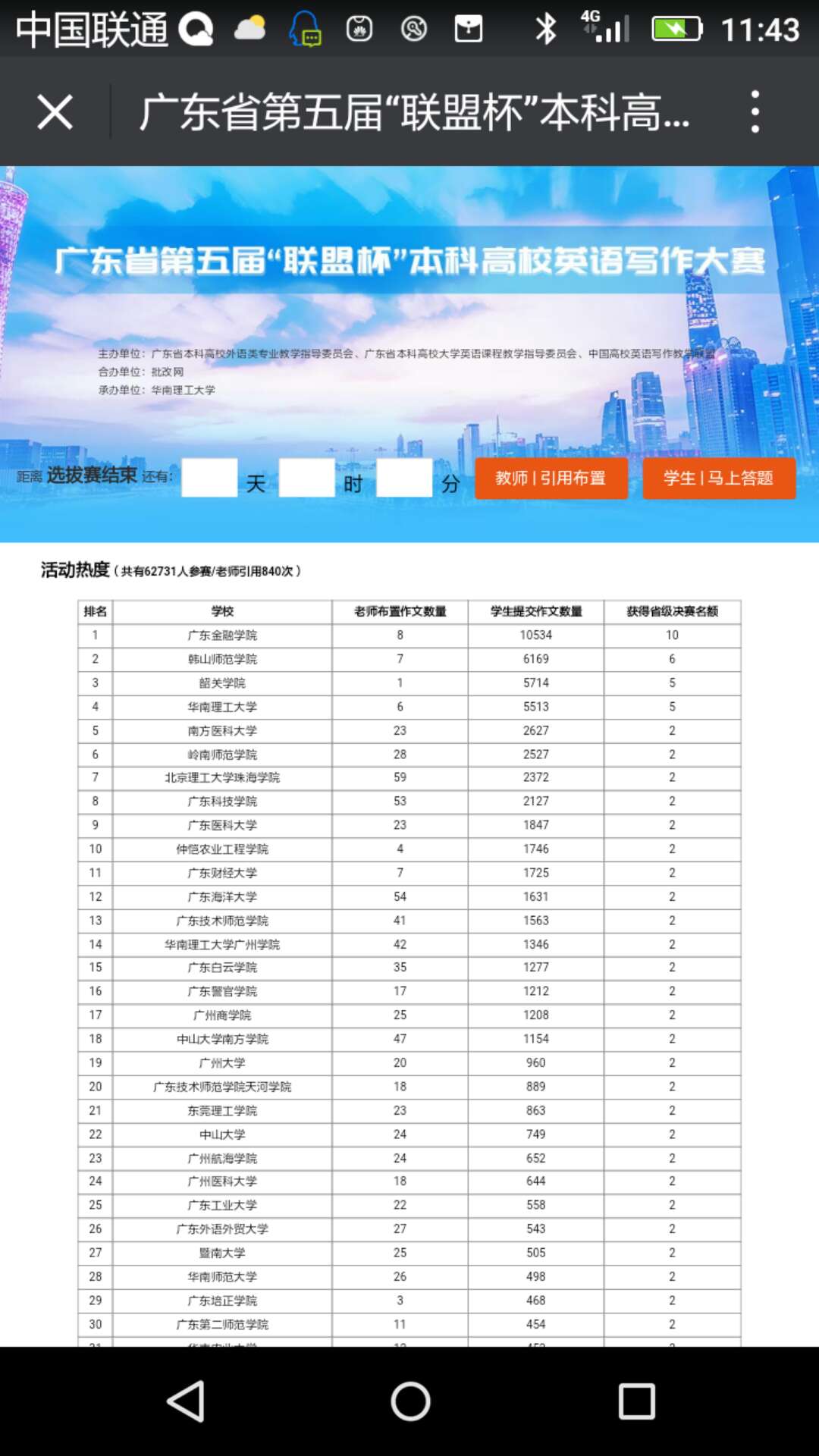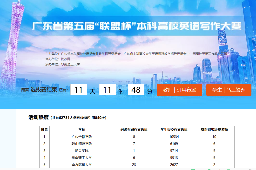在本次写作活动中,广东省高校共有62731人参赛,其中公司员工提交的作文数量为10534篇,在广东省各高校的参与活动热度最高,并获得10个决赛参赛名额,份额最多。希望公司参赛选手再接再厉,在指导老师的指导下,争取发挥自己的最好水平。