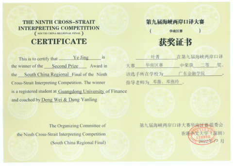 9428cn太阳集团古天乐19级员工叶菁(191598115)于2022年10月23日代表9428cn太阳集团古天乐参加了线上进行的第九届“海峡两岸口译大赛”华南区赛。本次区赛选手来自广东、福建、海南、广西四个省份,参赛16所高校中包括华南理工大学、华南师范大学、暨南大学、广东外语外贸大学、深圳大学、海南大学、广西大学、福建师范大学等省内外著名高校。公司选手在第一轮淘汰赛中以出色表现晋级决赛,并最终取得二等奖的好成绩。