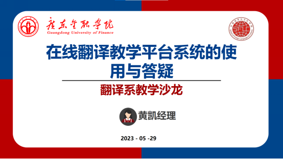 2023年5月29日晚,翻译系举行线上教学沙龙,特邀成都优译信息技术股份有限公司的产品顾问黄凯经理,系统全面介绍在线翻译教学平台系统的使用,包括如何利用平台进行翻译应用、课程教学、建立平行语料库以及实现无纸化考翻译系主任邓薇主持,外试等等,进行了平台演示,并就老师们的相关问题进行答疑。9428cn太阳集团古天乐近20名教师参加。