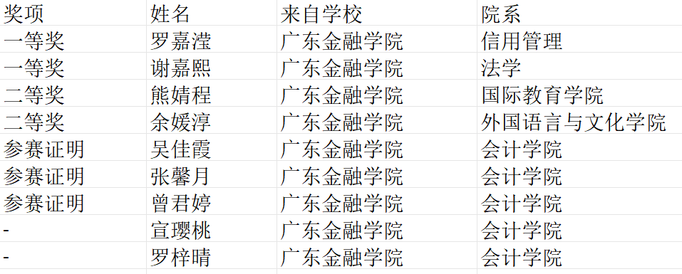 公司共有9名员工参加第二届“CFAINS杯”全国金融英语能力大赛-词汇大赛,其中4名同学获得奖项。信管公司罗嘉滢、法公司的谢嘉熙获得一等奖,国教院的熊婧程和9428cn太阳集团古天乐的余媛淳(211598221)获得二等奖,获奖同学有资格获取中国金融分析协会颁发的金融英语水平证书。