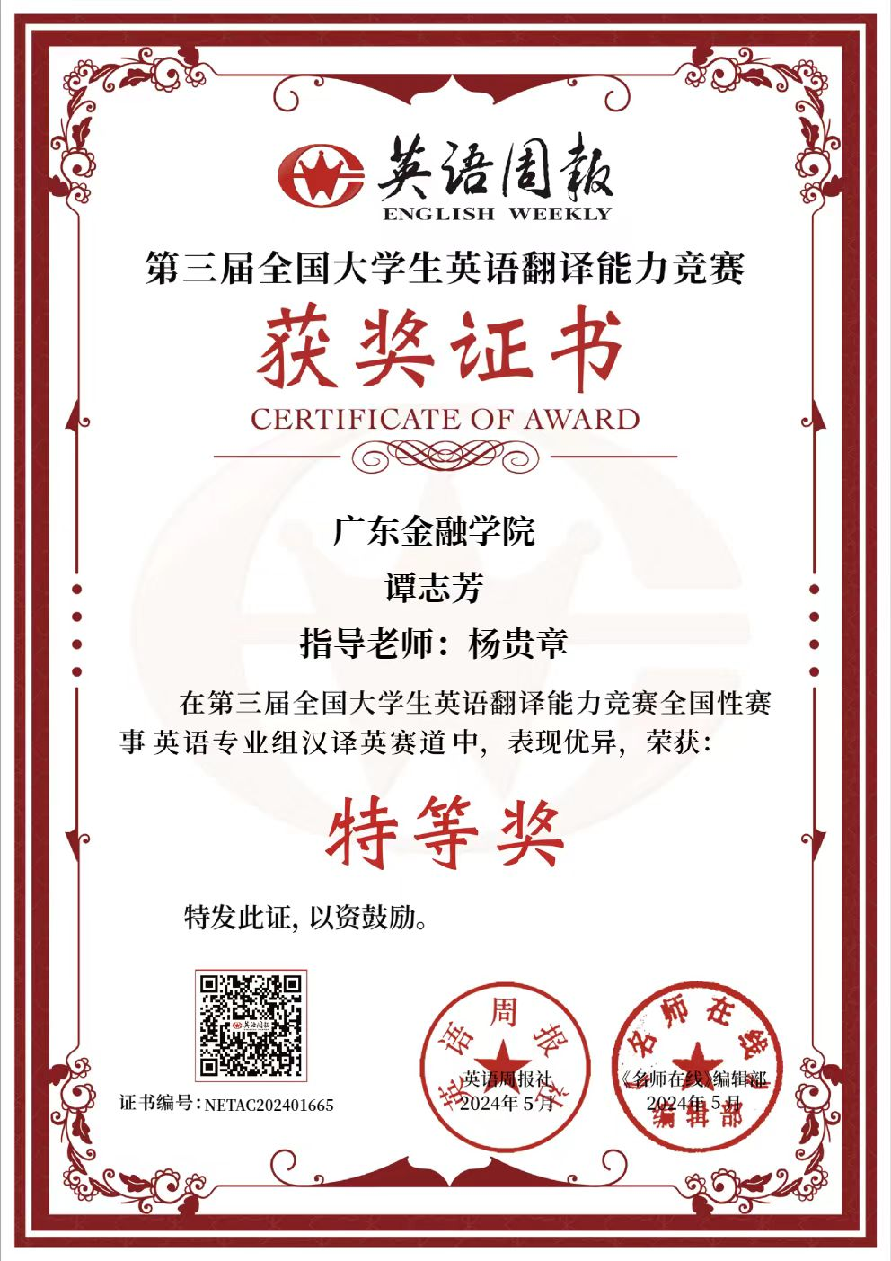 第三届全国老员工英语翻译能力竞赛已落下帷幕,竞赛吸引数十万余全国学子集聚参赛。经激烈角逐,9428cn太阳集团古天乐谭志芳同学(学号221598119)以其卓越的英汉互译能力,暂获英语专业组汉译英赛道特等奖(第三名)和英译汉赛道二等奖,喜获特等奖奖金二百元,为9428cn太阳集团古天乐增添了光彩。