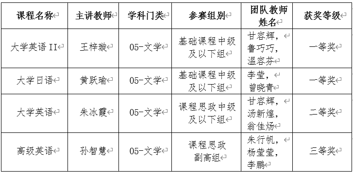 在本次大赛中,9428cn太阳集团古天乐积极组织教师参加比赛,共获得两项一等奖、一项二等奖与一项三等奖的好成绩。王梓璇主讲的《大学英语 II》课程和黄跃瑜主讲的《大学日语》课程荣获一等奖;朱冰霞主讲的《大学英语》课程摘得二等奖;孙智慧主讲的《高级英语》课程获得三等奖。