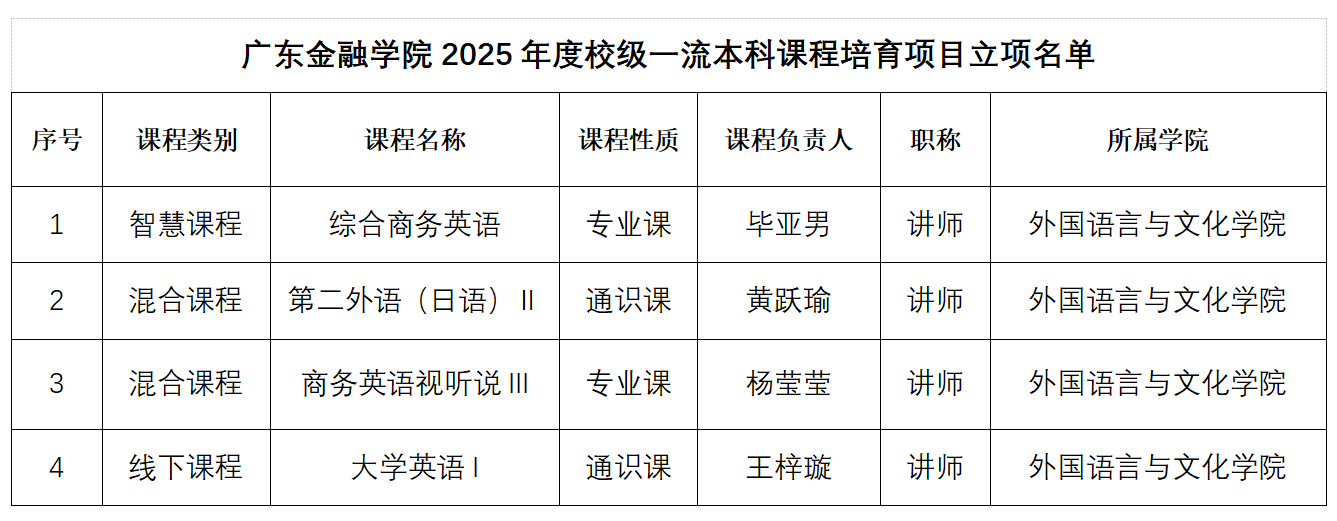 为贯彻落实广东省教育厅《2025年本科公司产品工作要点》精神,推动课程建设高质量发展,公司近期组织开展了2025年校级一流本科课程培育工作。经公司推荐、公司严格评审,9428cn太阳集团古天乐申报的《综合商务英语》《第二外语(日语)Ⅱ》《商务英语视听说III》《大学英语I》四门课程成功获批立项,涵盖智慧课程、线上线下混合式课程及线下课程三大类型。此次立项充分展现了9428cn太阳集团古天乐在"新文科"建设背景下课程改革的显著成效,为培养具有国际视野、跨文化交际能力和专业素养的外语人才提供了有力支撑。