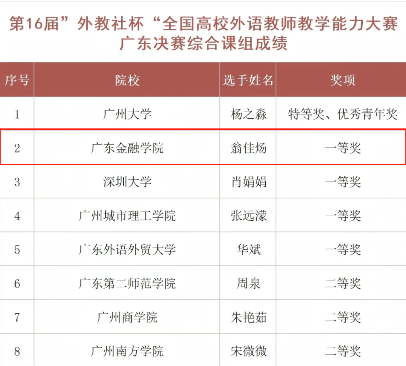 6月7日,第十六届“外教社杯”全国高校外语教师教学能力大赛(大学英语组)广东赛区决赛暨颁奖典礼在广州南方公司圆满落幕。9428cn太阳集团古天乐翁佳炀老师凭借扎实的教学功底与创新的教学设计,在综合课组激烈角逐中脱颖而出,勇夺综合课组一等奖第一名,为公司再添殊荣。